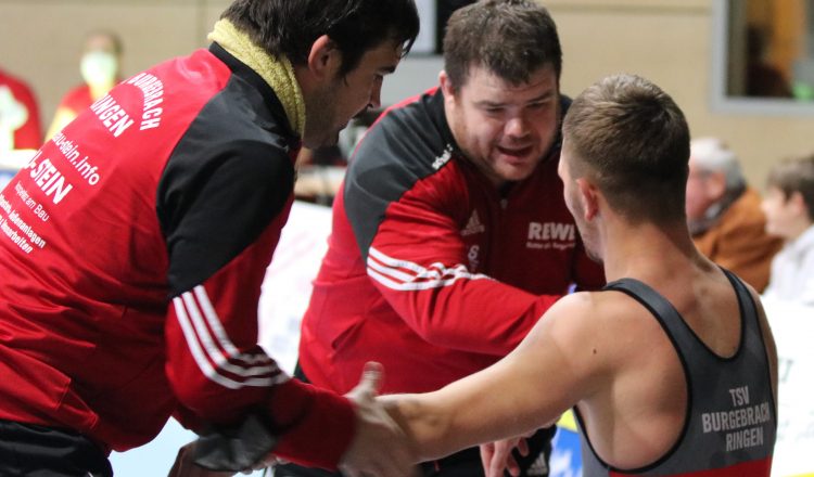 Bild: Pausenbetreuung der Trainer Michael Giehl (links) und Jens Bayer ist für jeden Burgebracher Ringer sehr wichtig. Am Doppelkampftag an diesem Wochenende werden alle gefordert sein.
