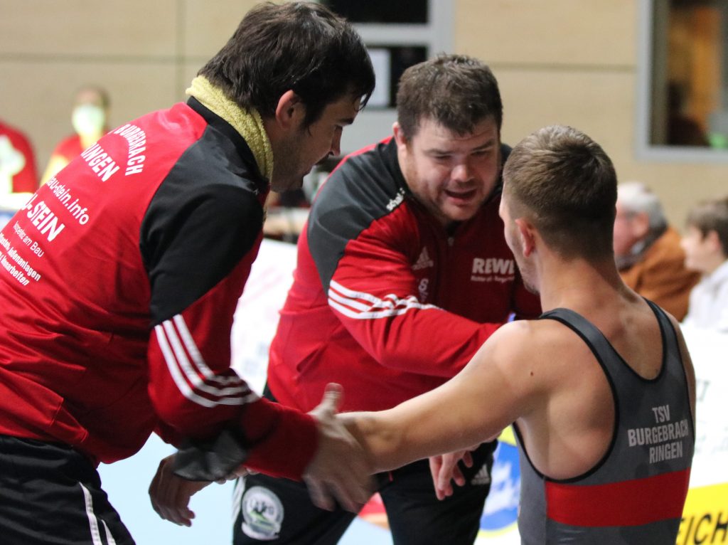 Bild: Pausenbetreuung der Trainer Michael Giehl (links) und Jens Bayer ist für jeden Burgebracher Ringer sehr wichtig. Am Doppelkampftag an diesem Wochenende werden alle gefordert sein.