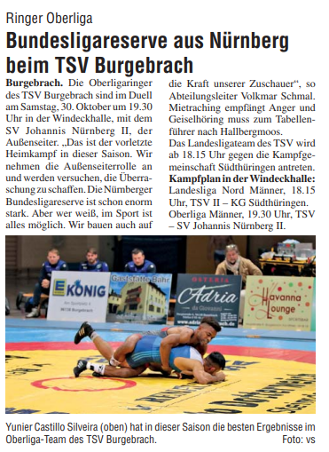 Ringer Oberliga Nürnberg kommt zum TSV Der vorletzte Heimkampf dieser Saison steht bevor. Dann kommt die Bundesligareserve des SV Johannis Nürnberg in die Windeck Halle. Der TSV Burgebrach ist in diesem Duell am Samstag um 19:30 Uhr der Außenseiter. Abteilungsleiter Volkmar Schmal „Wir nehmen die Außenseiterrolle an und werden versuchen, die Überraschung zu schaffen. Die Nürnberger sind schon enorm stark. Hier ringen bundesligagestandene Ringer. Unser Gegner hat einen breiten Kader. Sie können in alle Richtungen variieren. Aber wer weiß, im Sport ist alles möglich. Wir bauen auch auf die Kraft unserer Zuschauer“. Co-Trainer Jens Bayer führt weiter aus „Wir haben am vergangenem Wochenende zwei erfolgreiche Duelle absolviert. Wir sind bis in den Zehenspitzen motiviert. Es wird schwer, ist aber nicht unlösbar“. Mietraching empfängt Anger und Geiselhöring muss zum Tabellenführer nach Hallbergmoos. Das Landesligateam des TSV wird ab 18:15 Uhr gegen die Kampfgemeinschaft Südthüringen antreten. Kampfplan in der Windeck Halle Landesliga Nord Männer 18:15 Uhr TSV II – KG Südthüringen Oberliga Männer 19:30 Uhr TSV – SV Johannis Nürnberg II Bild: Der Burgebracher Felix Pflauger (oben) zeigte in dieser Saison starke kämpferische Leistungen mit hervorragenden Ergebnissen.